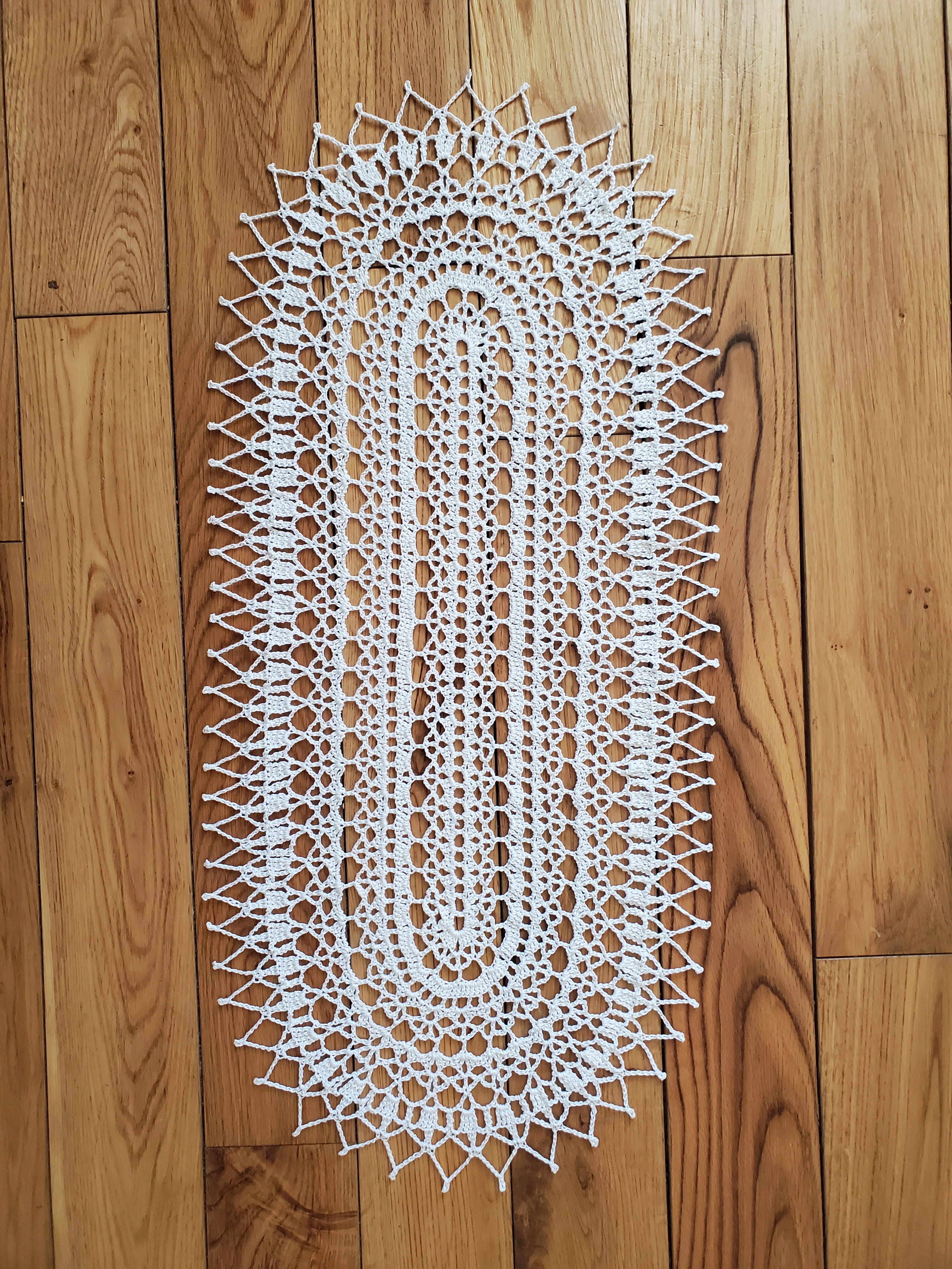 This doily has an elegant diamond design on both sides of the oval. I really loved this design, but I realized as I was working on the ends of the oval, the ends were not symmetrical, which I thought was strange! I think it would be ok to make them both a reflection of the other, but I just followed the diagram as shown and it still turned out amazing!