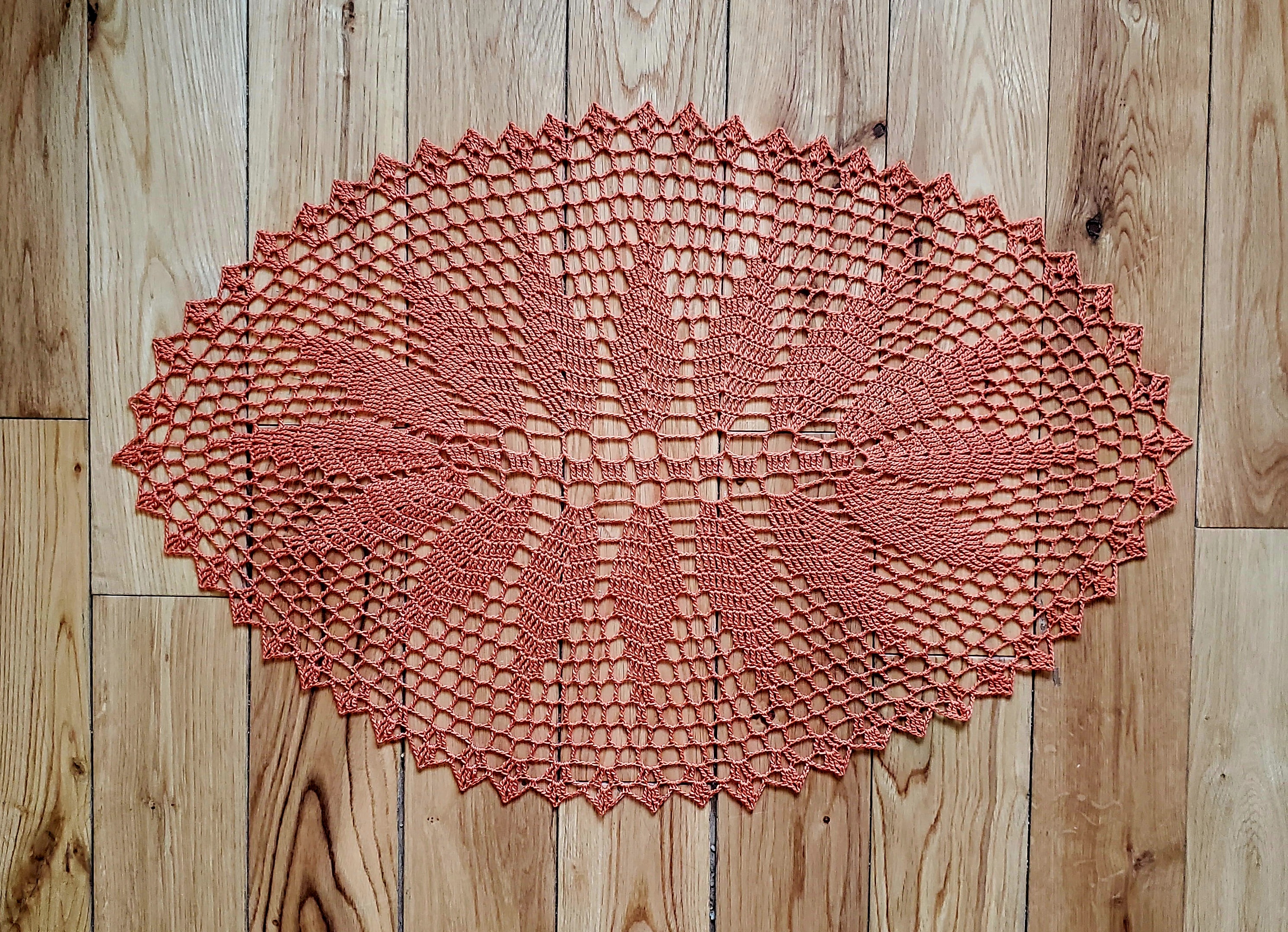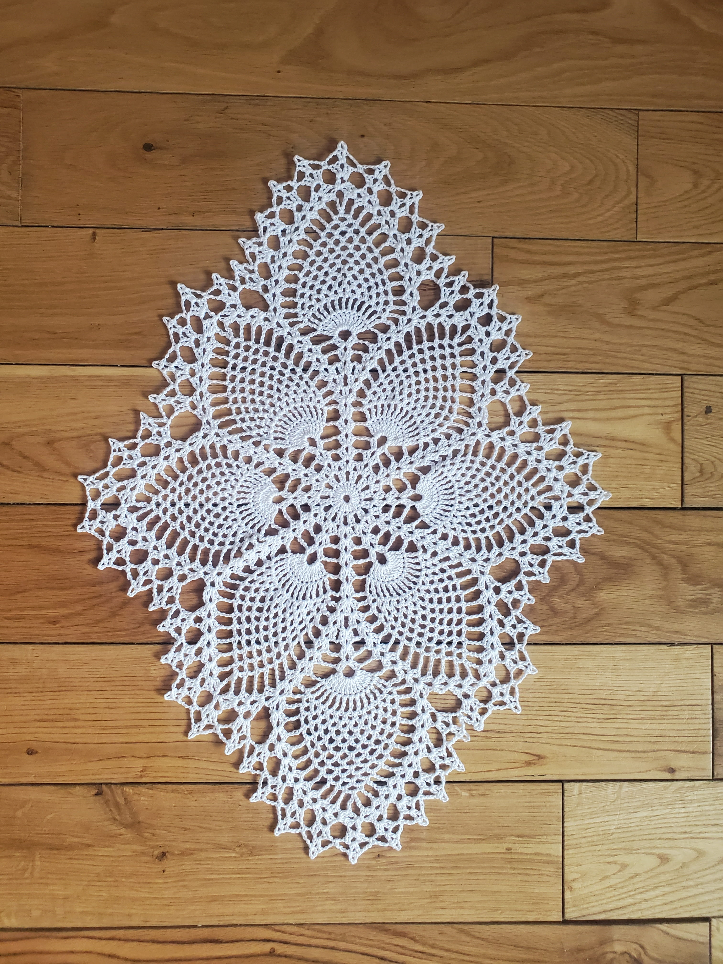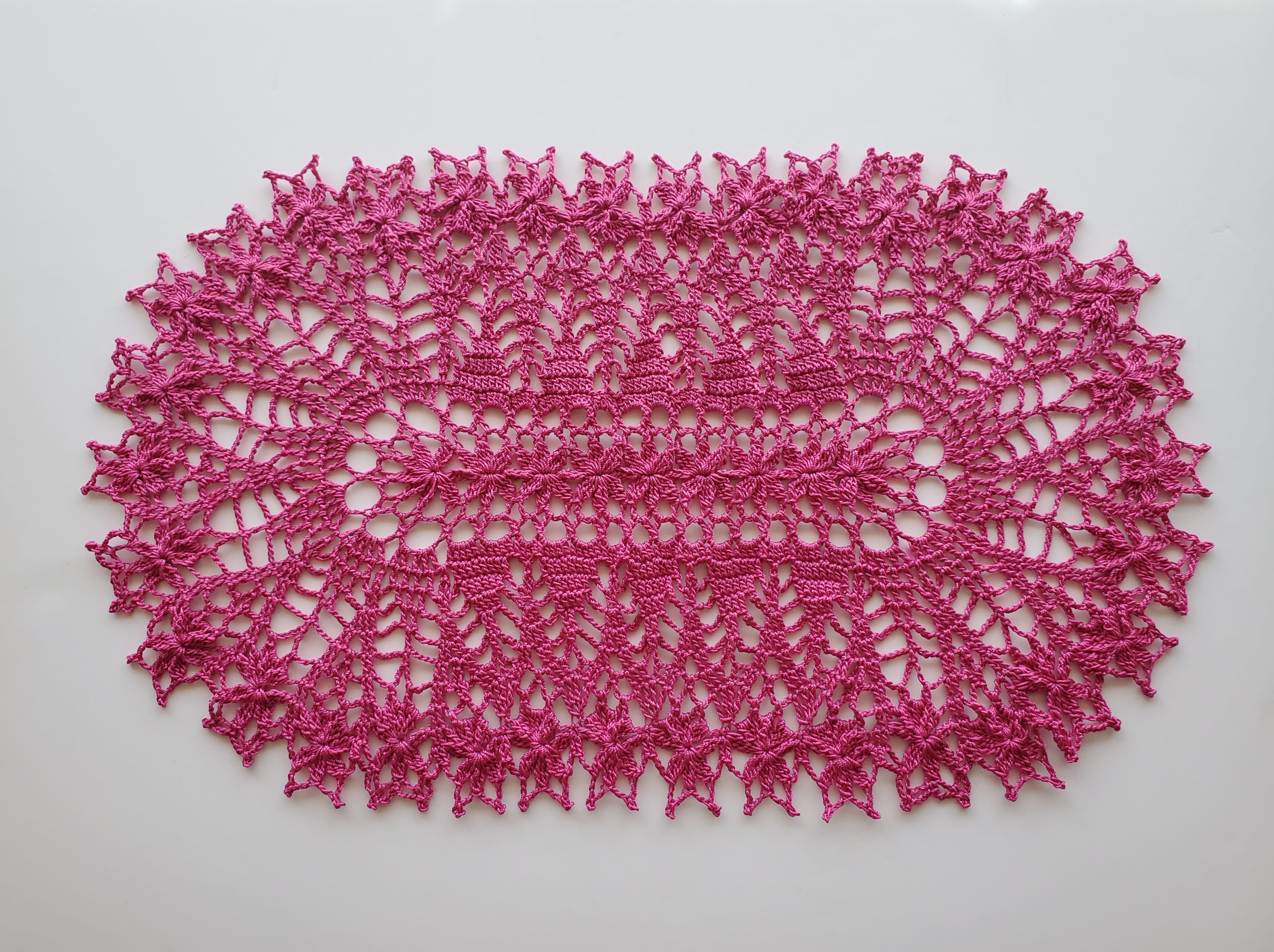 If you like pineapple motifs then you’ll enjoy making this oval doily! This was a really fun doily to make. You’ll have to be ok with cutting your thread and restarting in different places in order for the motifs to work correctly.