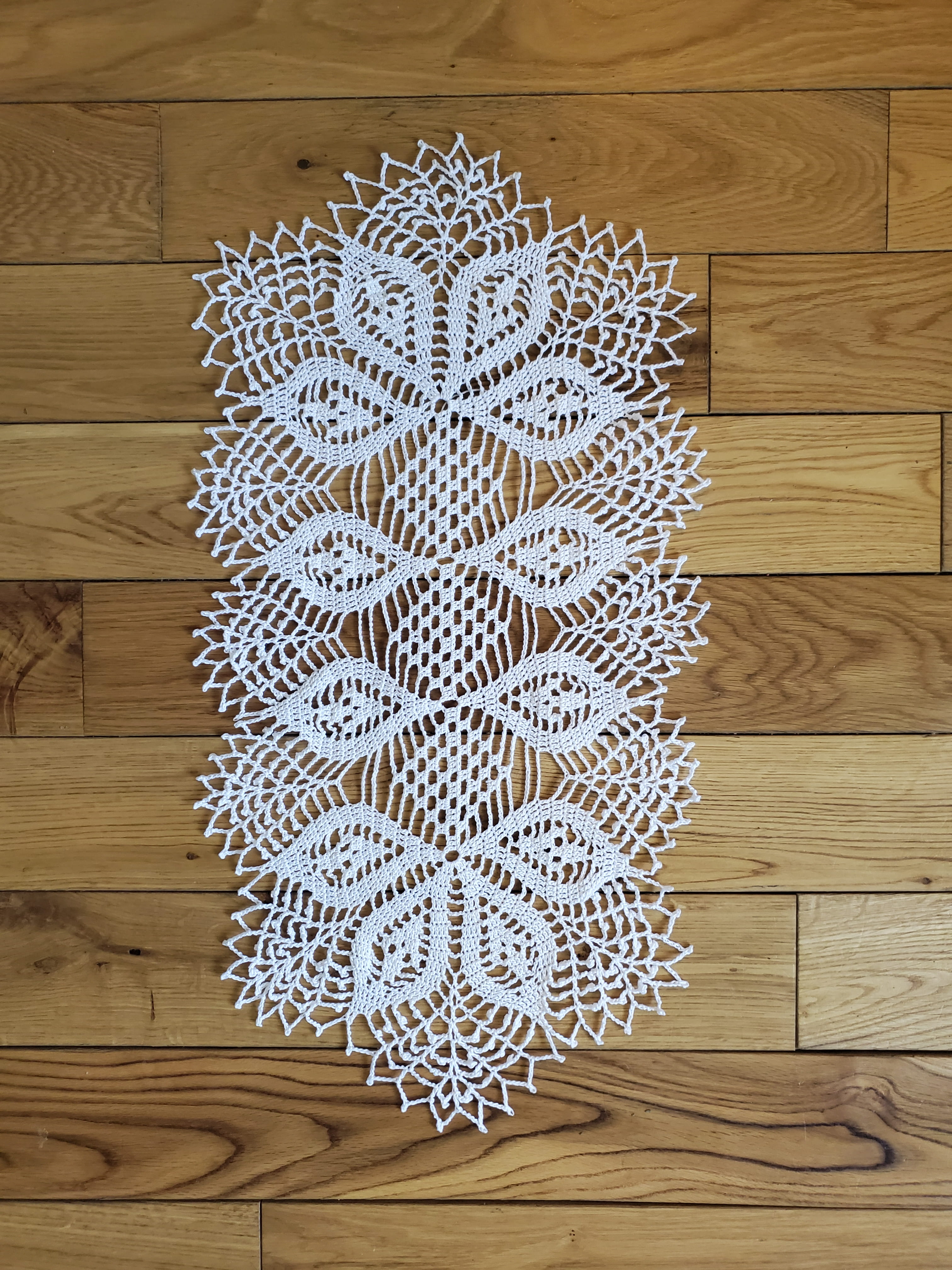 This oval doily is a big one, I was fooled and thought, oh 17 rounds can’t be that bad! It’s all treble crochets, so that’s what makes this doily huge, quickly. It’s a really neat design, with leaves shooting out from the ovals center line, just make sure you have enough thread!